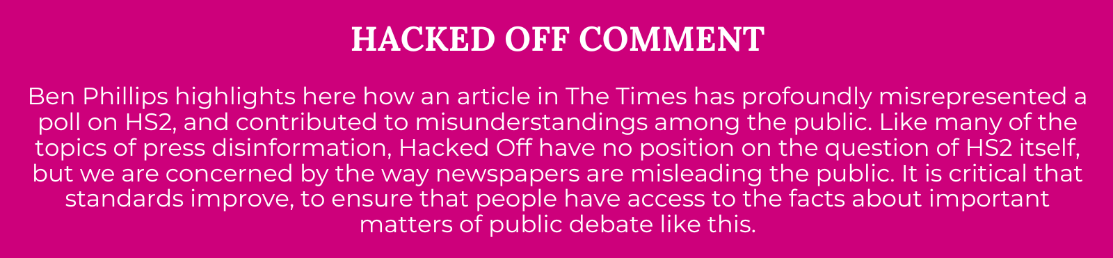 Two days before Chancellor Rachel Reeves delivered the November 2025 Budget, The Times published a story about an opinion poll by JL Partners on "HS2" (High Speed 2, a high speed railway line under construction linking Lnodon and the Midlands) under the headline “Half of Britons support scrapping HS2 to plug budget shortfall”. The article did not include basic polling disclosures, such as who commissioned the poll and the exact question wording. It also paraphrased the results into a stronger claim about what voters find “acceptable”. Had this context been provided, readers could have judged the poll’s framing and limitations for themselves. A request to The Times for transparency and corrections was rejected.